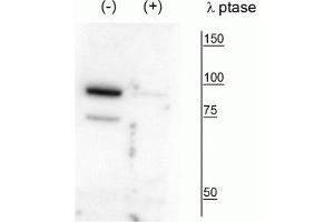 - Specific for the ~86 kDa PanK4 phosphorylated at Ser63. Immunolabeling of PanK4 is nearly eliminated with λ-phosphatase treatment.
