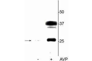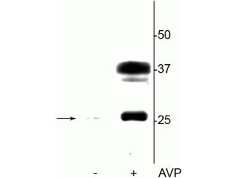 - Specific for endogenous levels of the ~29 kDa AQP2 protein phosphorylated at Ser264. Also recognizes the glycosylated form of AQP2 at ~37 kDa. Immunolabeling is blocked by preadsorption with the phosphopeptide used as antigen, but not by the corresponding non-phosphopeptide.