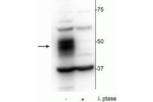 - Specific for endogenous levels of the ~51 kDa MEF2C protein phosphorylated at Ser222. Immunolabeling is completely eliminated by treatment with λ-phosphatase.