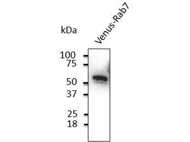 - In 293HEK cells transfected with cds plasmid detects a band of 27 kDa by Western blot. This antibody also recognizes Venus/GFP and does not cross-react to mCherry/red fluorescent proteins.
