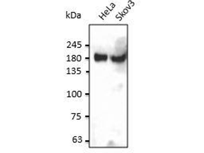 - Using liver, HeLa and Skov3 cell lysates detects a 180 kDa band by Western blot.