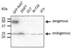 - Detects Rab7a protein in the human, rat and mouse whole cell lysates and transfected cells with GFP-Rab7a by Western blot. This Ab is specific for Rab7a.