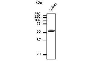 - Using spleen lysate detects a 52 kDa band by Western blot.