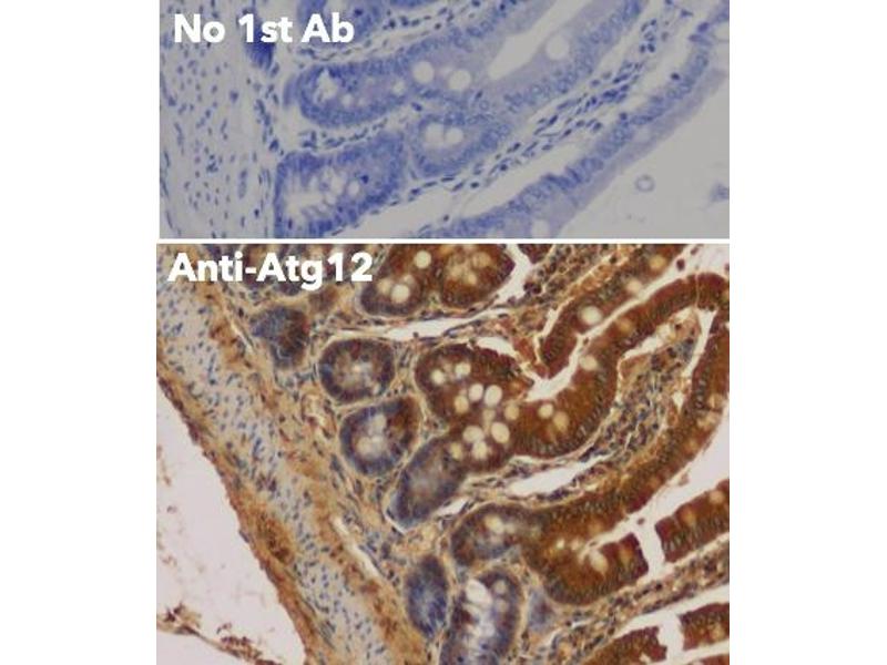 Goat polyclonal antibody to ATG12 - autophagosome marker. Autophagy is a process of bulk protein degradation in which cytoplasmic components, including organelles, are enclosed in double-membrane structures called autophagosomes and delivered to lysosomes or vacuoles for degradation. ATG12 is the human homolog of a yeast protein involved in autophagy.