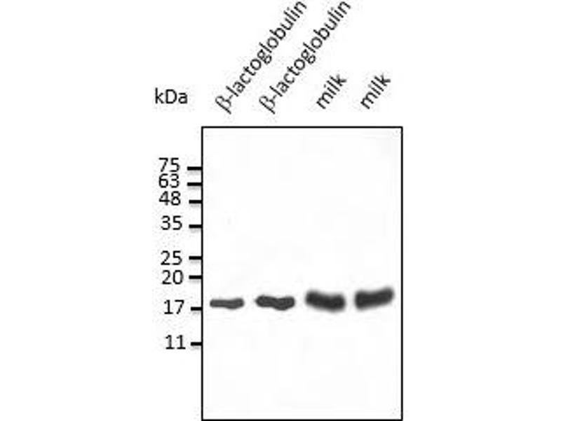 Goat polyclonal antibody to β-Lactoglobulin. β-Lactoglobulin is a small protein of 162 amino acids with a molecular mass of 18,400 Da and a member of the lipocalin family. This protein is the major whey protein of cow and other ruminants. No clear function has been identified for β-lactoglobulin. Although it binds to several hydrophobic molecules, suggesting its role in their transport. There is also a strong suggestion that the molecule exists primarily as a food source.