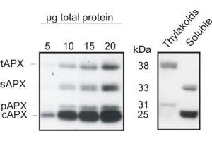 synthetic peptide derived from Arabidopsis thaliana tAPX (acession At1g77490) and sAPX (At1g08390) protein sequences, coupled to BSA. Five out of twelve amino acids are also identical with cAPX1 (At1g07890), cPX2 (At1g09640) and pAPX (At1g35000)