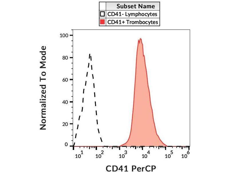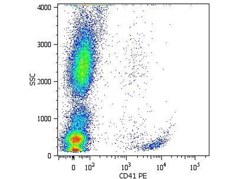 Integrin subunit alpha 2b,CD41 (platelet glycoprotein IIb) is composed of two subunits (120 kDa a, alpha and 23 kDa b, beta) that interact with CD61 in the presence of calcium to form a functional adhesive protein receptor. Upon blood vessel damage, this receptor binds to a variety of proteins including von Willebrand factor, fibrinogen, fibronectin and vitronectin. CD41 is mainly expressed on megakaryocyte-platelet lineage, but generally belongs to the antigens that are expressed during early stages of hematopoietic differentiation.,Platelet GPIIb, Integrin alpha-IIb, GPalpha IIb, GTA