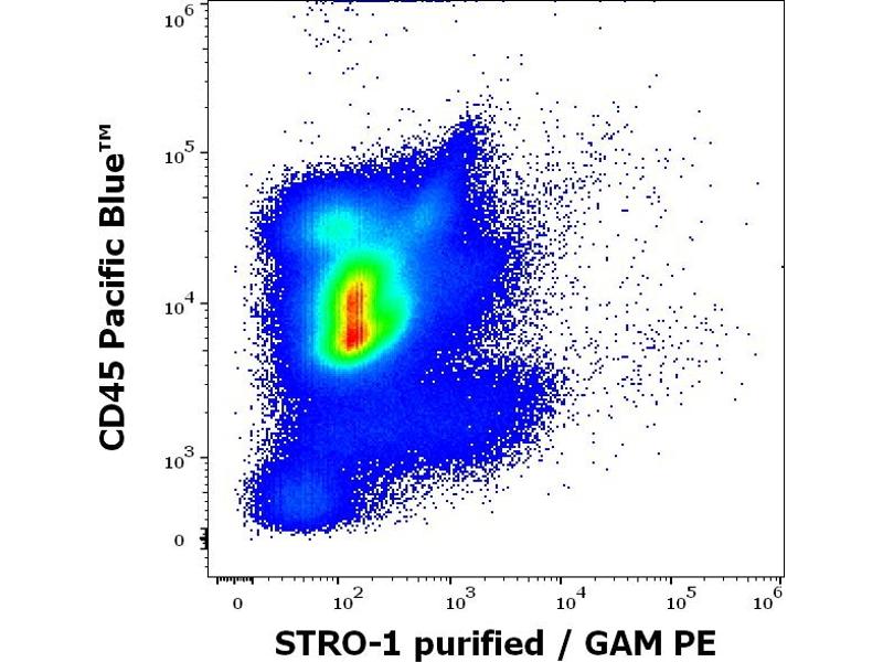 The mouse monoclonal antibody STRO-1 recognizes an extracellular epitope of the cell surface antigen STRO-1 expressed by bone marrow mesenchymal stromal cells and nucleated erythroid precursors, but not by committed hematopoietic progenitors.