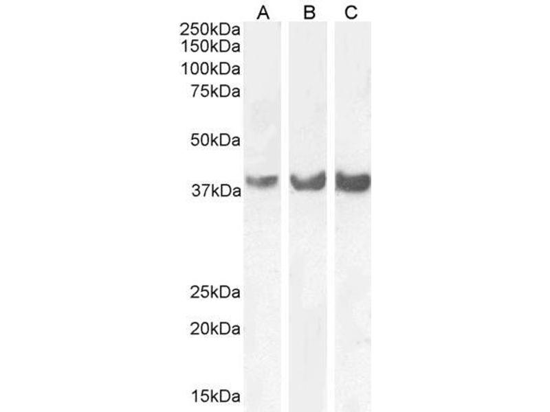 Western Blot: Approx 38 kDa band observed in Human (Cerebellum), Mouse and Rat Brain lysates (calculated MW of 36.1 kDa according to Human NP_000514.2, 35.9 kDa according to Mouse NP_032301.2 and 34.9 kDa according to Rat NP_001099356.1). Recommended concent