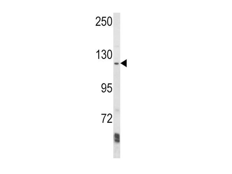 This AAK1 antibody is generated from rabbits immunized with a KLH conjugated synthetic peptide between 186-216 amino acids from the N-terminal region of human AAK1.