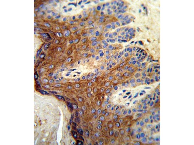 This ALOX12 antibody is generated from rabbits immunized with a KLH conjugated synthetic peptide between 618-650 amino acids from the C-terminal region of human ALOX12.