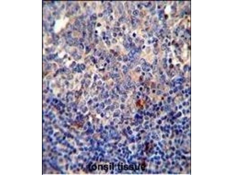 This BCL10 antibody is generated from rabbits immunized with a KLH conjugated synthetic peptide between 24-51 amino acids from the N-terminal region of human BCL10.