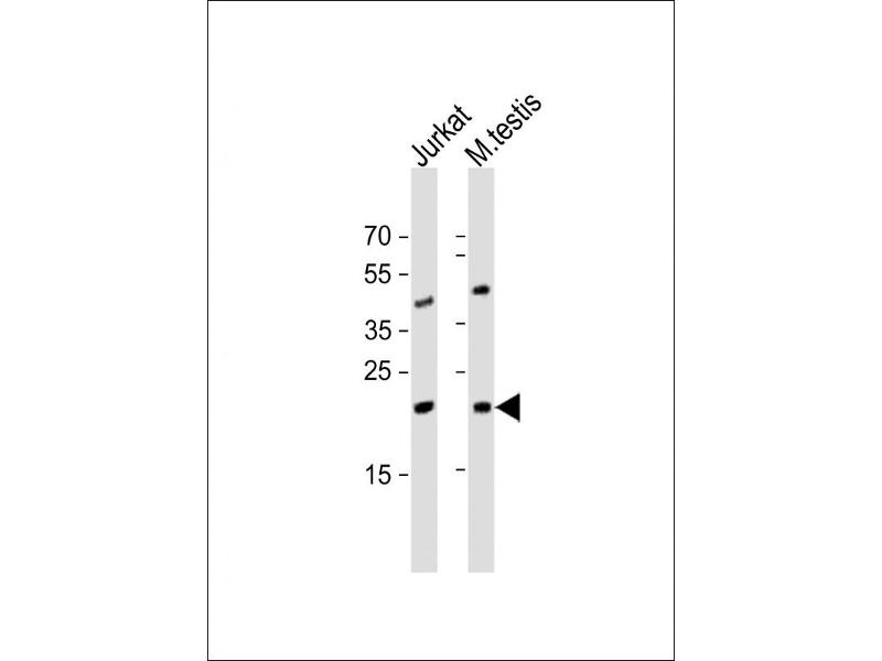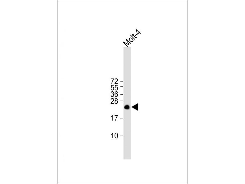 In Jurkat cells the signal is very week but longer exposure reveals the protein at the expected molecular weight. With 293T cells we see a stronger band just above 21kDa. This band was absent in Jurkat cells and in the purified proteins.