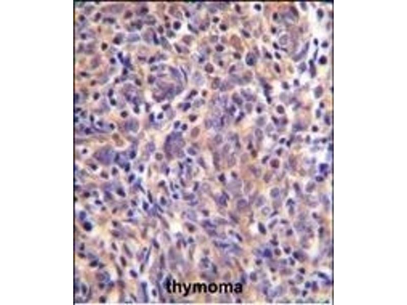 This THEMIS antibody is generated from rabbits immunized with a KLH conjugated synthetic peptide between 559-588 amino acids from the C-terminal region of human THEMIS.