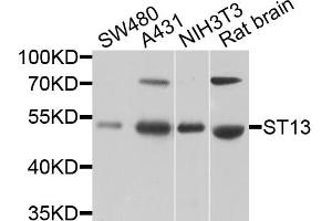 Synonyms: AAG 2,AAG2,Aging associated protein 2,F10A1,FAM10A1,FAM10A4,FLJ27260,Heat shock 70kD protein binding protein ,Hip,HOP,Hsc70 interacting protein,Hsc70-interacting protein,Hsp70 interacting protein,HSPABP 1,HSPABP,HSPABP1,MGC129952,OTTHUMP00000028873,P48,PRO0786,Progesterone receptor associated p48 protein,Progesterone receptor-associated p48 protein,Protein FAM10A1,Putative tumor suppressor ST13,Renal carcinoma antigen NY REN 33,Renal carcinoma antigen NY-REN-33,SNC 6,SNC6,ST 13,St13,Suppression of tumorigenicity 13 ,Suppression of tumorigenicity 13 (colon carcinoma),Suppression of tumorigenicity 13 protein,Suppression of tumorigenicity protein 13