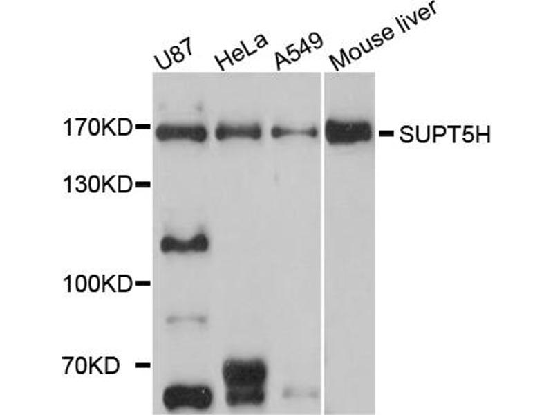 Background: SUPT5H, also named as DSIF p160, is a 1087 amino acid protein, which belongs to the SPT5 family. SUPT5H localizes in the nucleus and is ubiquitously expressed. SUPT5H is a component of the DRB sensitivity-inducing factor complex (DSIF complex), which regulates mRNA processing and transcription elongation by RNA polymerase II. SUPT5H is modified through phosphorylation and methylated, so the molecular weight of SUPT5H might be 140-150 kDa.