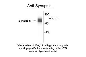 Anti-Synapsin I Antibody was produced in rabbit by repeated immunizations with native bovine synapsin I protein purified from bovine brain.