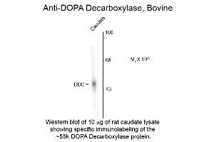 Anti-DOPA Decarboxylase Antibody is tested for use in ELISA and Western Blotting. Specific conditions for reactivity should be optimized by the end user. Expect a band of approximately 55 kDa in size corresponding to the DDC proteins in the appropriate cell lysate or extract.