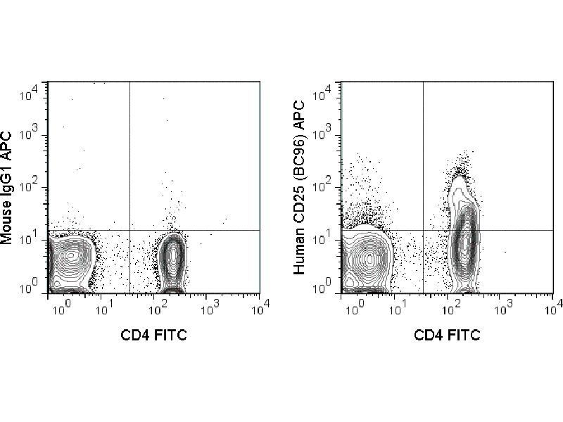 Background: The BC96 antibody is specific for human CD25, a 55 kDa surface protein also known as the Interleukin-2 Receptor alpha chain, or IL-2R alpha. CD25 may bind IL-2 by itself, although with low affinity and without induction of cell signaling. CD25 is also expressed within a high-affinity complex, along with the IL-2R beta chain (CD122) and the common gamma chain (CD132), to form a signaling receptor complex. Signaling via CD25 may modulate Th17 and Treg cell differentiation, and has been shown to play a role in the function of dendritic cells. The BC96 antibody may be used as a marker for expression of CD25 during T and B cell development, on activated mature T and B cells, and for its expression at high levels on natural T regulatory cells (nTreg cells) in the thymus or periphery, and on induced peripheral Tregs.