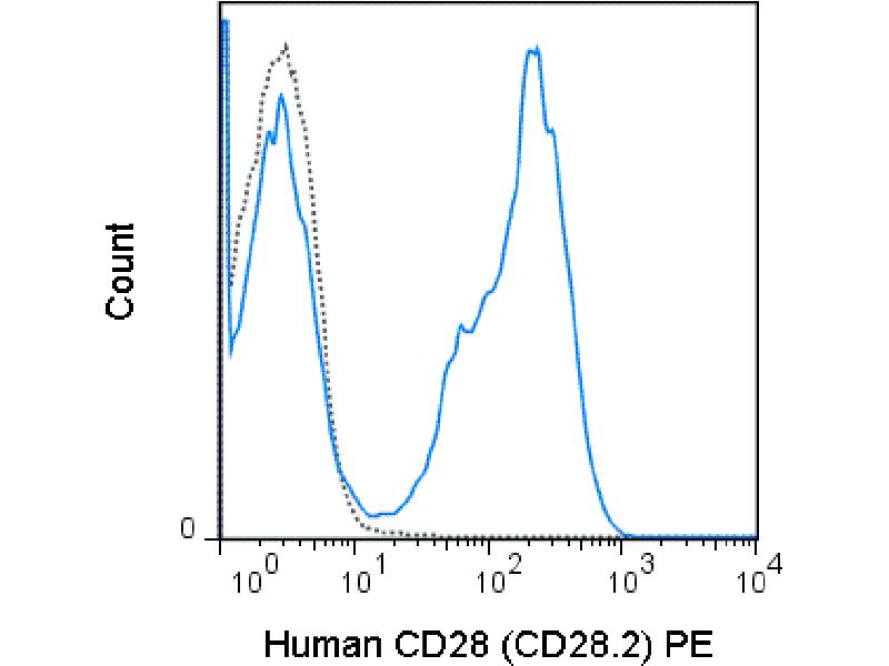 Background: The CD28 antibody reacts with human CD28, a 44 kDa type I surface glycoprotein which acts as a co-stimulatory receptor in support of the T cell receptor (TCR). CD28 exists as a homodimer with specificity for two known ligands, known as B7-1 (CD80) and B7-2 (CD86), which are expressed on activated B cells and antigen-presenting cells. These ligands trigger CD28 signaling in concert with TCR activation to drive T cell proliferation, induce high-level expression of IL-2, impart resistance to apoptosis, and enhance T cell cytotoxicity. The interaction / co-stimulatory signaling between the B7 ligands and CD28 provides crucial communication between T cells and B cells or APCs to coordinate the adaptive immune response. Other members of the CD28 family of receptors include CTLA-4 (CD152), PD-1 (CD279), ICOS and BTLA. The CD28.2 antibody may be used as a phenotypic marker for human CD28, expressed on all CD4+ T cells and CD8+ T cells, and is widely used as a reagent for activation of the CD28 receptor in vitro and in vivo.