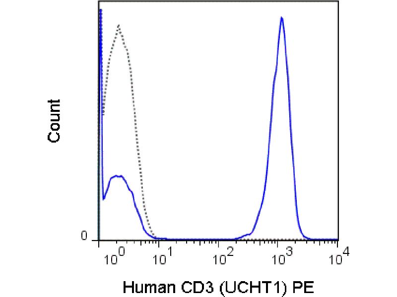 Background: The UCHT1 antibody is specific for human CD3e, also known as CD3 epsilon, a 20 kDa subunit of the T cell receptor complex, along with CD3 gamma and CD3 delta. These integral membrane protein chains assemble with additional chains of the T cell receptor (TCR), as well as CD3 zeta chain, to form the T cell receptor - CD3 complex. Together with co-receptors CD4 or CD8, the complex serves to recognize antigens bound to MHC molecules on antigen-presenting cells. These interactions promote T cell receptor signaling (T cell activation), inducing cell proliferation, differentiation, production of cytokines or activation-induced cell death. CD3 is differentially expressed during thymocyte-to-T cell development and on all mature T cells.The UCHT1 antibody is a widely used phenotypic marker for human T cells. In addition, binding/cross-linking of UCHT1 antibody to CD3e can induce cell activation. A recent publication of the crystal structure of a CD3e- antibody complex provides insight as to the action of commonly used agonist antibodies, as well as specific epitope-binding data for the human CD3 antibodies UCHT1 and OKT3. UCHT1 antibody reacts with both surface-expressed and intracellular CD3e protein, in contrast to an alternative human CD3 clone, HIT3a, which will stain only the extracellular (membrane-expressed) CD3e protein. Also, the UCHT1 antibody is reported to be cross-reactive with chimpanzee and has been used for phenotypic analysis of expression by flow cytometry, however the antibody is reported to be unsuitable for induction of T cell activation in this species.