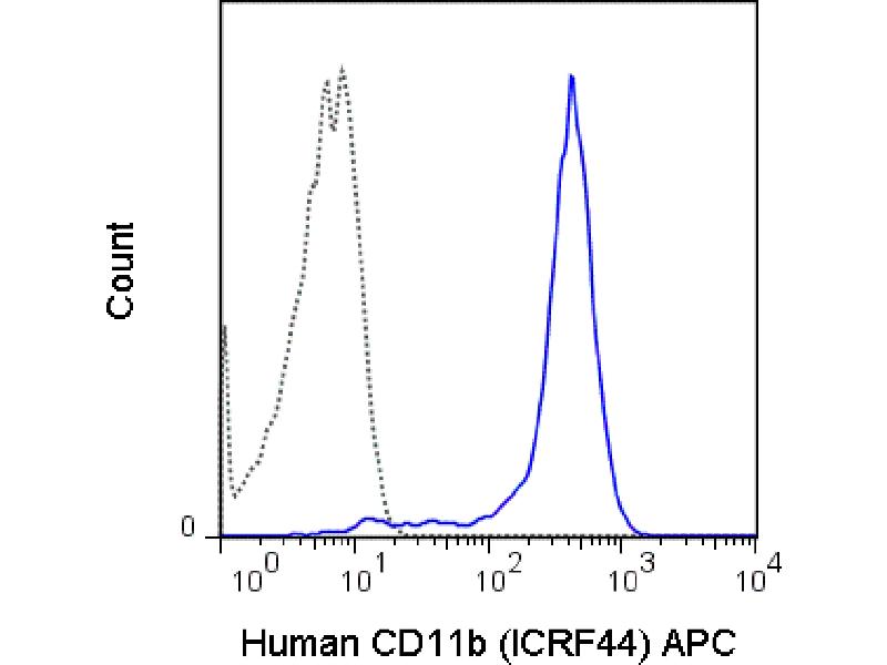 Background: The ICRF44 antibody reacts with human CD11b, also known as integrin alpha M. This 165-170 kDa cell surface glycoprotein is part of a family of integrin receptors that mediate adhesion between cells (cell-cell) and components of the extracellular matrix, e.g. fibrinogen (cell-matrix). In addition, integrins are active signaling receptors which recruit leukocytes to inflammatory sites and promote cell activation. Complete, functional integrin receptors consist of distinct combinations of integrin chains which are differentially expressed. Integrin alpha M (CD11b) assembles with Integrin beta-2 (CD18) into a receptor known as Macrophage Antigen-1 (Mac-1) or complement receptor type 3 (CR3). This receptor binds and induces intracellular signaling through ICAM-1, ICAM-2, ICAM-3 and ICAM-4 on endothelial cells and can also facilitate removal of iC3b bearing foreign cells.The ICRF44 antibody is widely used as a marker for CD11b expression on macrophages, granulocytes, and subsets of NK cells.