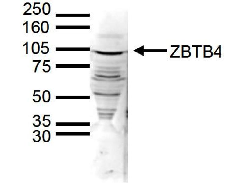 Anti-ZBTB4 Antibody has been tested by ELISA and Western Blots. Specific conditions for reactivity should be optimized by the end user. Expect a band approximately 105 kDa in the appropriate cell lysate or extract.