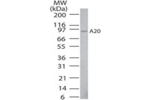 Anti-A20 antibody is tested for use in WB, Flow, Flow-IC, ICC/IF, IHC, IHC-P, and IP. Expect a band approximately 90kDa on specific lysates. Specific conditions for reactivity should be optimized by the end user.