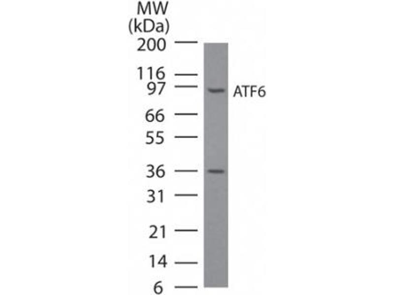 Background: Anti-ATF6 antibody detects human ATF6. ATF6 is a constitutively expressed, endoplasmic reticulum (ER) membrane-anchored transcription factor. ATF6 is a key transcriptional activator of the unfolded protein response (UPR), which allows mammalian cells to maintain cellular homeostasis when they are subjected to environmental and physiological stresses that target the ER. The C-terminus of ATF6 is located in the ER lumen and its N-terminal DNA binding domain faces the cytosol. AFT6 plays a key role in the ER stress response by transmitting the ER stress signal across the ER membrane into the nucleus. The induction of new gene expression by ATF6 is an important aspect of the ER stress response. In response to certain stress conditions, ATF6 translocates from the ER to the Golgi. The 90 kDa full-length ATF6 is processed within the Golgi to its active 50 kDa form through sequential cleavage by site-1 and site-2 proteases (S1P and S2P). Proteolytic activation of ATF6 in the ER stress response is a mechanism to regulate membrane-bound factors, and is referred to as regulated intramembrane proteolysis. The N-terminal active ATF6 translocates to the nucleus where it binds to ER stress-response elements in ER stress-response genes (ERSRGs). ATF6 is a potent transcriptional activator of ERSRGs. The fully glycosylated form of ATF6, a 670 amino acid protein, exhibits an electrophoretic mobility of ~90 kDa in denaturing SDS-gels, in part because of the glycosylated modifications. ATF6 has 3 consensus sites for N-linked glycosylation and exists constitutively as a glycosylated protein. Differentially glycosylated ATF6 forms may result from mutations or experimental treatment. Anti-ATF6 antibody is ideal for investigators involved in apoptosis research.