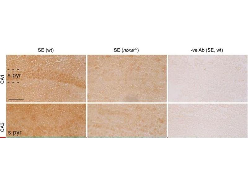 Background: Anti-Noxa antibody detects human Noxa. Recently, a BH-3 only member of the Bcl-2 family have been identified in human and mouse and designated as Noxa (for damage). The expression of the Noxa gene involves direct activation of its promoter by p53. Increased expression of Noxa protein occurs in normal thymocytes but not in p53-deficient thymocytes. Noxa cDNA codes for a 103-amino acid protein. The coimmunoprecipitation data suggest that Noxa protein may interact with proteins belonging to the Bcl-2 family, such as, Bcl-XL and Mcl-1. Oda et al. have also shown that blocking the endogenous Noxa induction results in the suppression of apoptosis. Treatment of cells with Noxa antisense oligonucleotides blocks radiation-induced apoptosis suggesting that Noxa may represent a mediator of p53-dependent apoptosis. Anti-Noxa antibody is ideal for investigators involved in apaoptosis research.