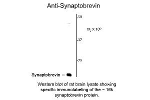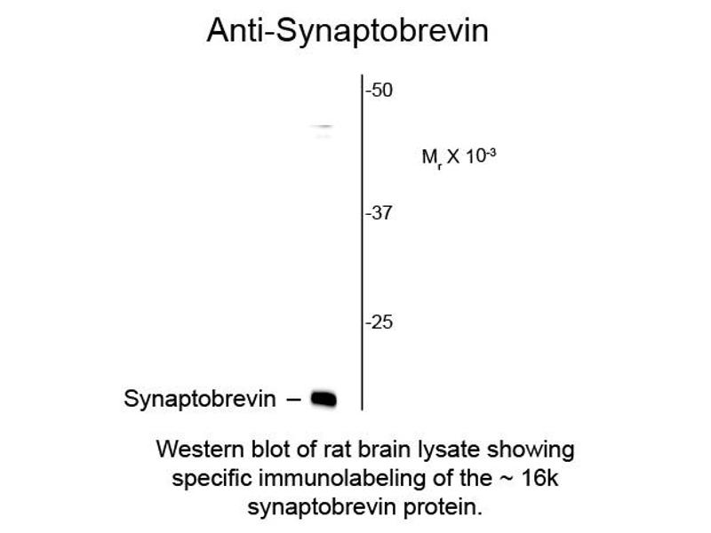 Anti-Synaptobrevin antibody has been tested in Western Blotting and IHC. Expect a band of approximately 16 kDa in size corresponding to the VAMP proteins in Western blot of rat brain lysate. Anti-Synaptobrevin antibody has also been demonstrated to work in immunohistochemistry on formalin fixed, vibratome sections, but does not work on paraffin sections. Specific conditions for reactivity should be optimized by the end user. Researchers should determine optimal titers for applications that are not stated below.