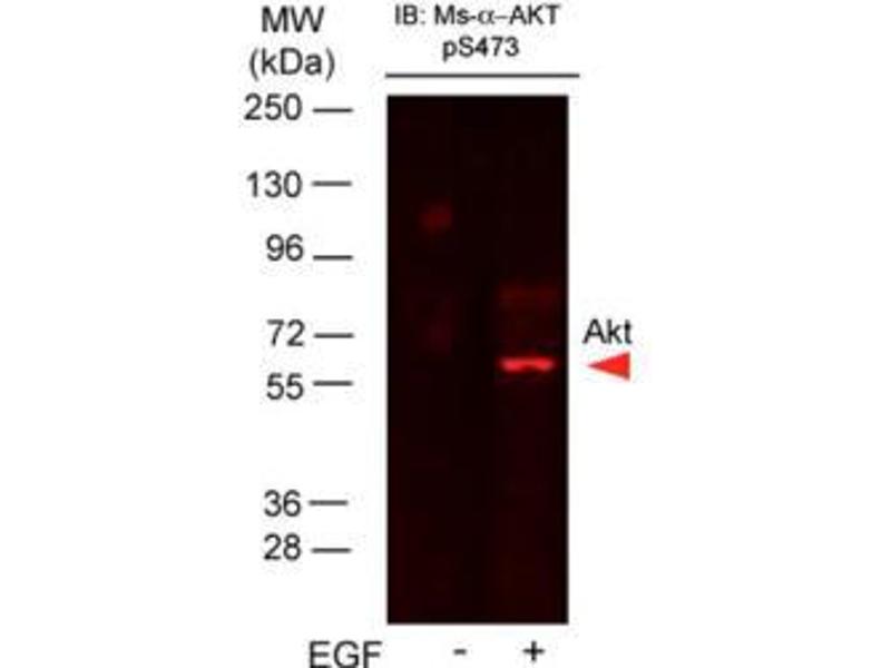 This monoclonal antibody is tested in western blotting. This antibody is suitable for immunofluorescence microscopy, FLISA, and flow cytometry. Expect a band approximately 56 kDa in size corresponding to phosphorylated AKT protein by western blotting in the appropriate cell lysate or extract. This phospho-specific monoclonal antibody reacts with human and mouse AKT pS473 and shows minimal reactivity by ELISA against the non-phosphorylated form of the immunizing peptide. Specific conditions for reactivity should be optimized by the end user.