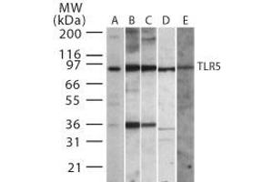 - TLR5 Antibody was produced from whole rabbit serum prepared by repeated immunizations with a KLH-conjugated peptide corresponding to internal amino acids on human TLR5 protein.