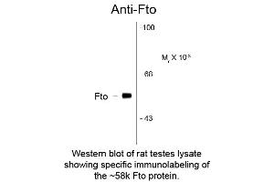 Anti-FTO (Mouse) Antibody has been tested in Western Blotting and ICC. Specific conditions for reactivity should be optimized by the end user. Expect a band of approximately 58 kDa in size corresponding to FTO proteins in Western blots of rat testes lysate. This antibody has also been used for immunocytochemistry with neuronal progenitor cells.