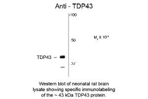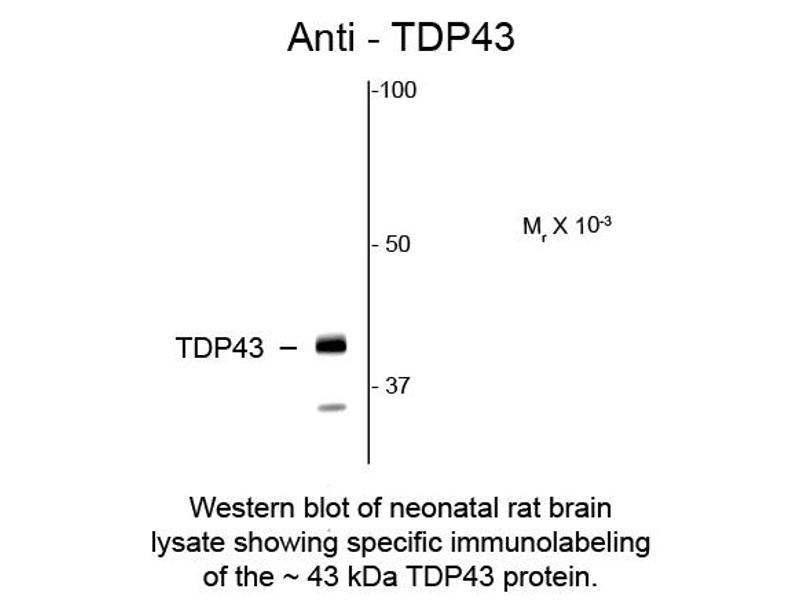 Anti-TDP43 (Rabbit) antibody is tested for use in Western Blotting and IHC. Specific conditions for reactivity should be optimized by the end user. Expect a band of approximately 43 kDa in size corresponding to the TDP43 protein in Western Blots of rat brain lysate. Molecular weight is dependent upon the TDP43 species present in the sample, full-length or truncated TDP43. Under non-denaturing conditions (for example, by IHC), this antibody detects TDP-43 inclusions in human brain tissue with TDP-43 proteinopathy, but does not detect full-length nuclear TDP-43. Under denaturing conditions (for example, by Western Blot analysis) this antibody detects the C-terminus of full-length and truncated human TDP-43. Researchers should determine optimal titers for applications that are not stated below.