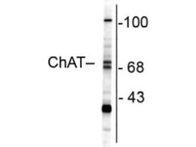 Anti-ChAT antibody has been tested in western blot and IHC and is suitable for use in ELISA. Specific conditions for reactivity should be optimized by the end user. Expect a ~ 68/70 kDa band corresponding to choline acetyltransferase protein by Western Blot in the appropriate lysate or tissue.