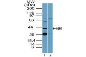 - HB9 Antibody was produced from whole rabbit serum prepared by repeated immunizations with mouse protein HB9 at an internal portion of amino acids.