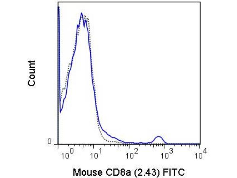 Background: CD8a antibody reacts with the 32-34 kDa alpha subunit of mouse CD8, known as CD8a or CD8 alpha. CD8a can form a homodimer (CD8 alpha-alpha), but is more commonly expressed as a heterodimer with a second chain known as CD8b or CD8 beta. CD8 acts as a co-receptor in antigen recognition and subsequent T cell activation induced by binding of the T cell receptor (TCR) to antigen-bearing MHC Class I molecules. The cytoplasmic domains of CD8 provide binding sites for the tyrosine kinase lck and facilitate intracellular signaling events that lead to T cell activation, development, and cytotoxic effector functions. CD8+ cytotoxic T cells (CTLs) play an important role in inducing cell death of tumor cells, as well as cells infected by virus, bacteria or parasites. The 2.43 antibody is widely used as a phenotypic marker for mouse CD8 on cytotoxic T cells, thymocytes, as well as on certain cell types that do not also express the TCR, including some NK cells and lymphoid dendritic cells.