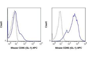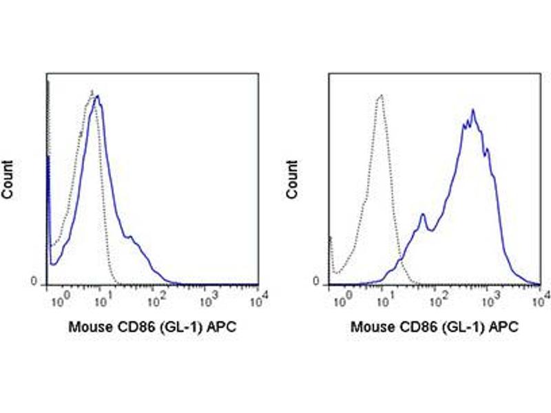 Background: Anti-CD86 reacts with mouse CD86, also known as B7-2, an 80 kDa cell surface protein which is a ligand for CD28, a co-stimulatory receptor for the T cell receptor (TCR). CD28 can also bind a second B7 ligand known as CD80 (B7-1). Both CD80 and CD86 are expressed on activated B cells and antigen-presenting cells. These ligands trigger CD28 signaling in concert with TCR activation to drive T cell proliferation, induce high-level expression of IL-2, impart resistance to apoptosis, and enhance T cell cytotoxicity. The interaction / co-stimulatory signaling between the B7 ligands and CD28 provides crucial communication between T cells and B cells or APCs to coordinate the adaptive immune response. The GL-1 antibody may be used as a marker for CD86 expression on B cells, macrophages, and dendritic cells.