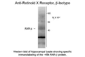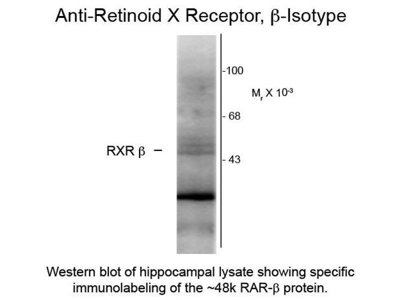 Anti-Retinoid X Receptor beta antibody has been tested by Western Blotting. Specific conditions for reactivity should be optimized by the end user. Expect a band of approximately 48 kDa in size corresponding to the RXR-β protein in the appropriate cell lysate or extract.