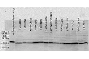 PDI Antibody was produced from whole rabbit serum prepared by repeated immunizations raised against rat PDI synthetic peptide conjugated to KLH.