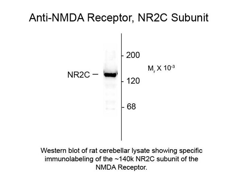 Anti-NMDA R2C Antibody is tested for use in Western Blotting and Immunoprecipitation and suitable for IHC and IF. Specific conditions for reactivity should be optimized by the end user. Expect a band of approximately 140 kDa in size corresponding to the NR2C subunit of the NMDA receptor. This antibody also labels the approximately 180 kDa NR2A and NR2B subunits of the NMDA receptor.