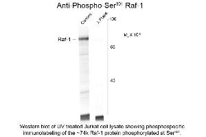 Anti-Raf-1 pS301antibody is tested for use in Western Blotting. Specific conditions for reactivity should be optimized by the end user. Expect a band of approximately 74 kDa in size corresponding to the Raf-1 protein phosphorylated at Ser301 in the appropriate cell lysate or extract. Immunolabeling of the Raf-1 protein band is blocked by lambda-phosphatase treatment.
