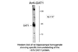 Anti-GAT1 (Rabbit) Antibody is tested for use in Western Blotting and IHC. Specific conditions for reactivity should be optimized by the end user. Expect a band at approximately 67 kDa in size corresponding to GABA Transporter 1 protein in the appropriate cell lysate or extract.