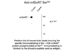 Anti-mGluR7 pS862 (Rabbit) antibody is tested for use in Western Blotting. Specific conditions for reactivity should be optimized by the end user. Expect a band of approximately 102 kDa in size corresponding to the mGluR7 protein phosphorylated at Ser862 in the appropriate cell lysate or extract.