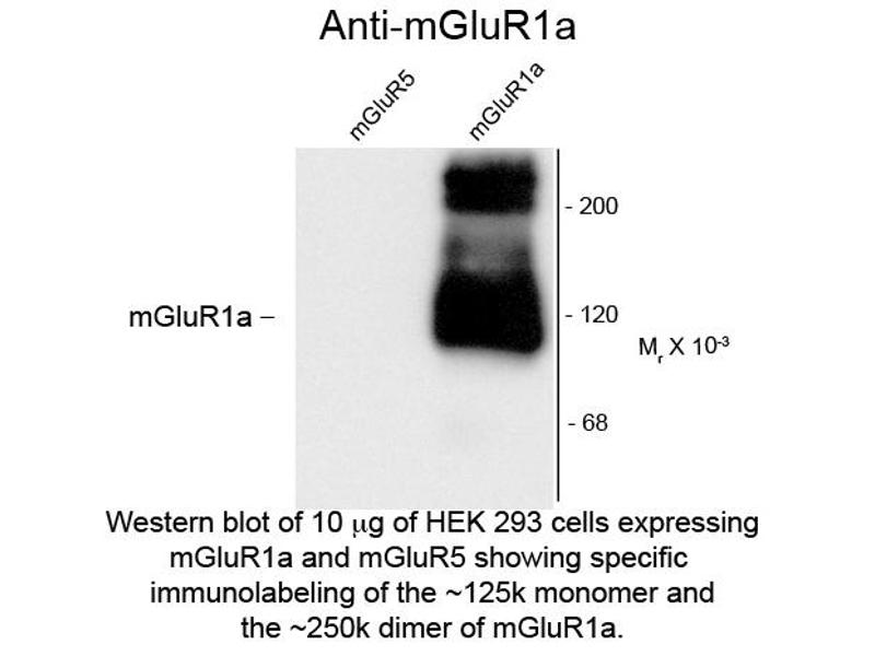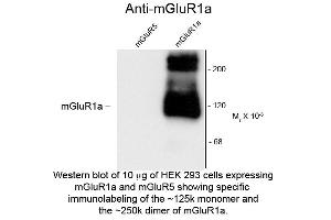 Background: mGluR1a antibodies detect GluR1a. GluR1a is the metabotropic glutamate receptors (mGluRs) are key receptors in the modulation of excitatory synaptic transmission in the central nervous system. They are implicated in many forms of neural plasticity as well as learning and memory and drug abuse. Group I metabotropic glutamate receptors (consisting of mGluR1 and mGluR5) are G-protein-coupled neurotransmitter receptors that are localized in the perisynaptic region of the postsynaptic membrane. When activated, Group I mGluRs lead to stimulation of phospholipase and activation of Protein Kinase C. In contrast, activation of Group II metabotropic receptors (mGluR2 and mGluR3) leads to inhibition of adenylate cyclase. The mGluR1 receptor may also be critically involved in limiting the deleterious effects of excitotoxicity. Therefore, mGluR1a antibody is ideal for investigators involved in neuronal plasticitiy, cell signaling and neuroscience.