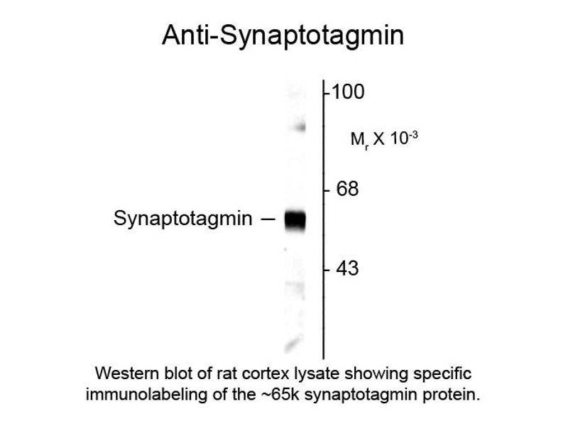 Anti-Synaptotagmin 1 antibody is tested for use in Western Blotting. Expect a band of approximately 65 kDa in size corresponding to synaptotagmin I protein in the appropriate cell lysate or extract. Researchers should determine optimal titers for applications that are not stated below.