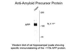 Anti-Beta Amyloid antibody is tested for use in ELISA, Western Blotting. Specific conditions for reactivity should be optimized by the end user. Expect a band of approximately 115 kDa in size corresponding to the APP protein in the appropriate cell lysate or extract.