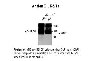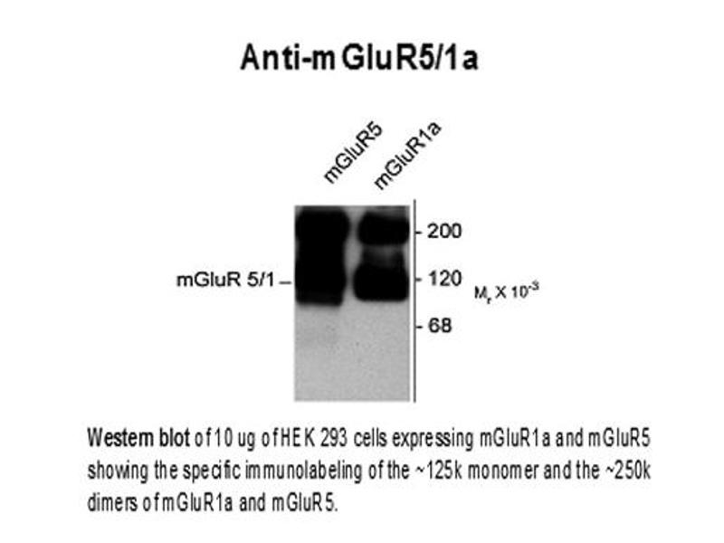 Anti-mGluR5/1a (Rabbit) antibody is tested for use in Western Blotting and IHC. Specific conditions for reactivity should be optimized by the end user. Expect a band of approximately 125 kDa monomer and 250 kDa dimer in size corresponding to mGluR5 and mGluR1 proteins in the appropriate cell lysate or extract.