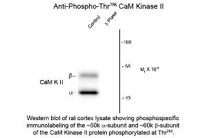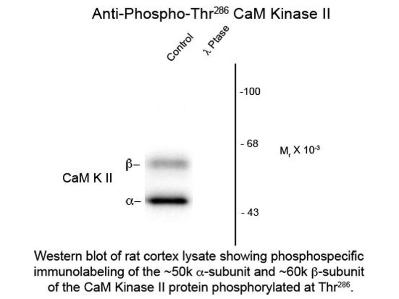 Anti-CaM Kinase II pT286 antibody is tested for use in ELISA and Western Blotting. Specific conditions for reactivity should be optimized by the end user. Expect a band of approximately 50 kDa in size corresponding to alpha CaM Kinase II and 60 kDa corresponding to beta CaM Kinase II proteins phosphorylated at Thr286.